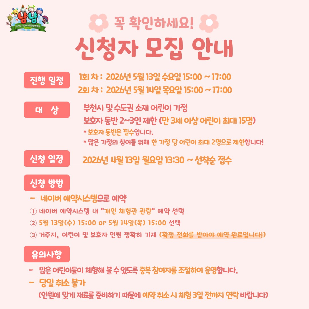 경기도어린이식품안전체험관 부천센터, 가정의 달, 요리체험 프로그램 『스페셜 패밀리데이』 참여가정 모집